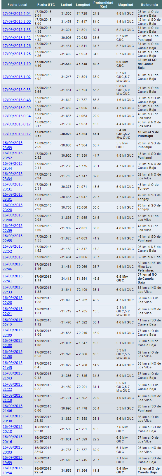 Desde las 22:54 horas UTC (Universal Time Coordinate) del día 16 de septiembre hasta las 05:04 horas UTC, o sea poco más de 6 horas después del terremoto se produjeron hasta 45 réplicas del mismo.